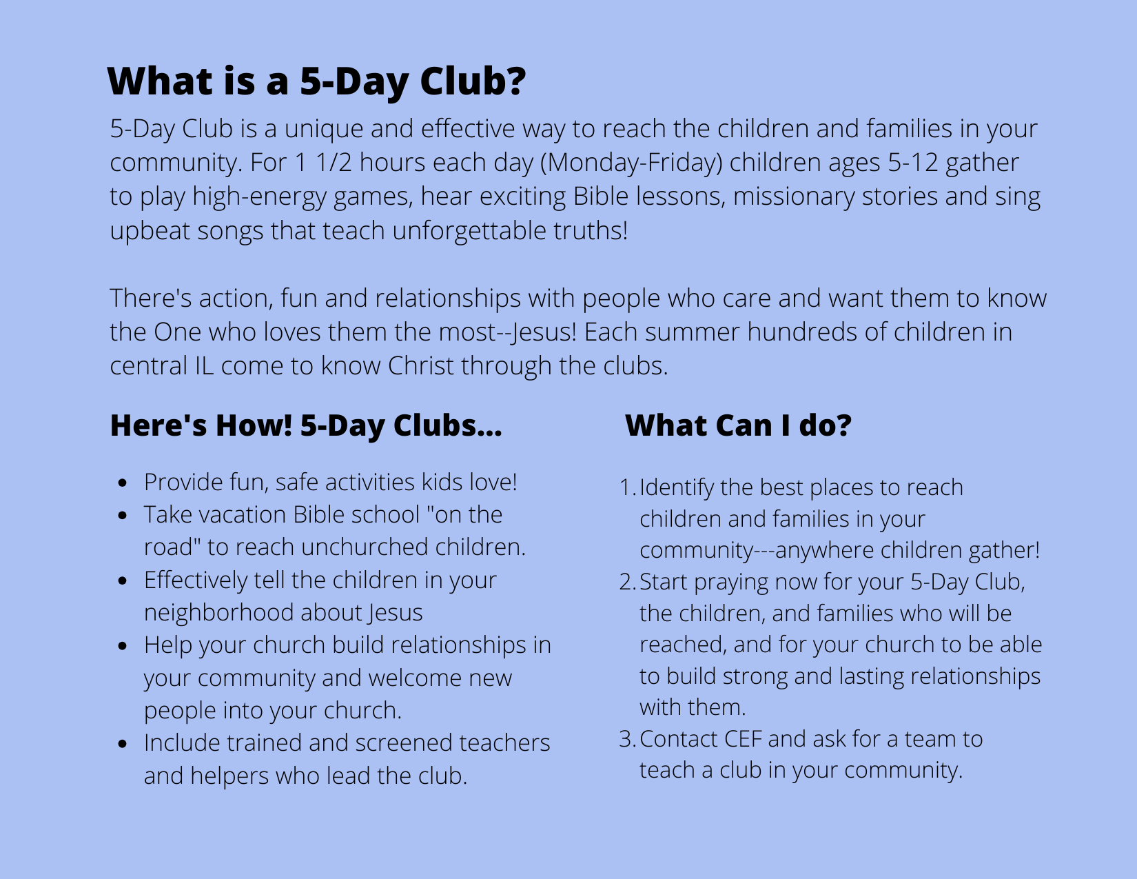 Child Evangelism Fellowship® is a Bible-centered organization composed of born-again believers whose purpose is to evangelize boys and girls with the Gospel of the Lord Jesus Christ and to establish (disciple) them in the Word of God and in a local church for Christian living.